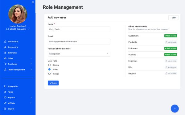 Give your team access to manage customers, send estimates, create invoices, record expenses and view reports to improve the efficiency of your business.